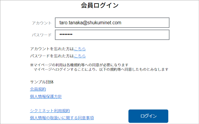②「アカウント」「(仮)パスワード」を入力し、「ログイン」をクリックします。